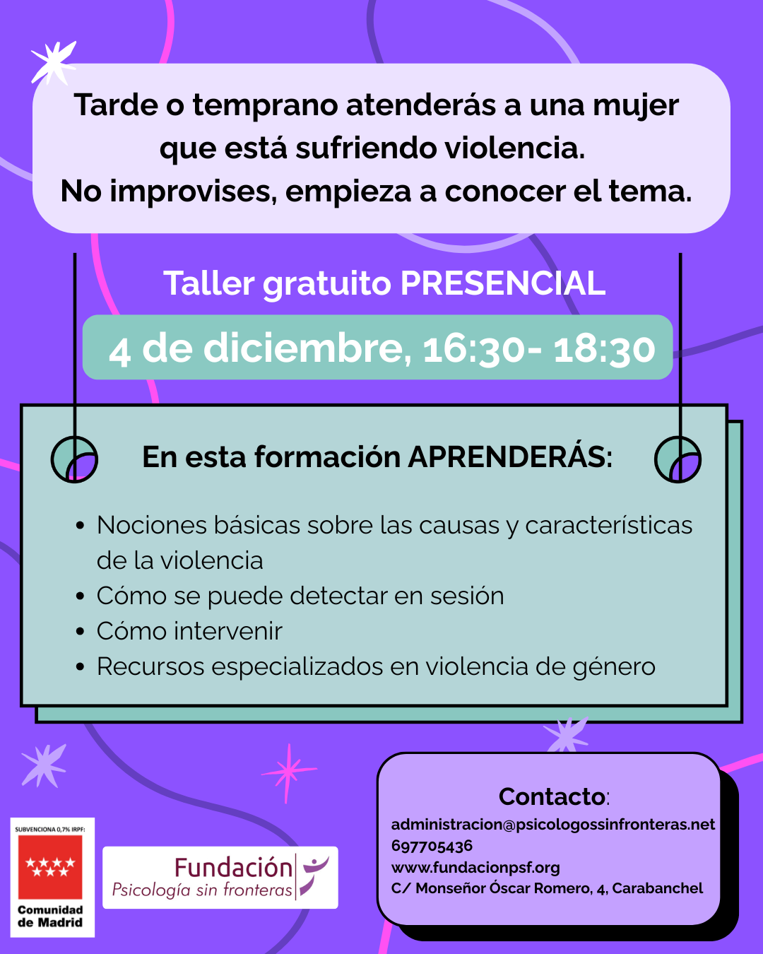 Más información: administracion@psicologossinfronteras.net o en el teléfono 697705436.