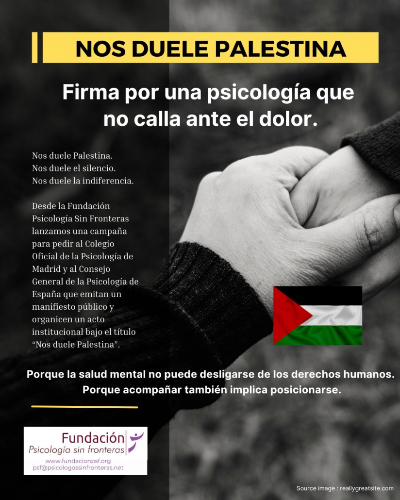 - Organicen un acto institucional, abierto a la ciudadanía y al conjunto de la profesión, bajo el título “Nos duele Palestina”, que visibilice el papel de la psicología ante la violencia y las crisis humanitarias.